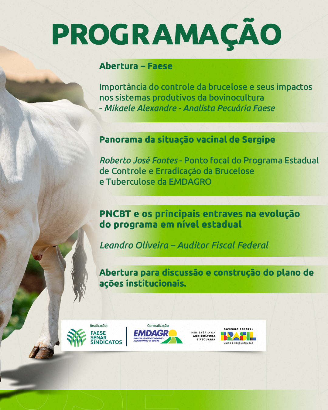 O evento é voltado para produtores rurais das cadeias da bovinocultura de corte e leite, além de profissionais e estudantes das ciências agrárias, representantes de laticínios, frigoríficos, revendedores e comerciantes de vacinas contra brucelose.