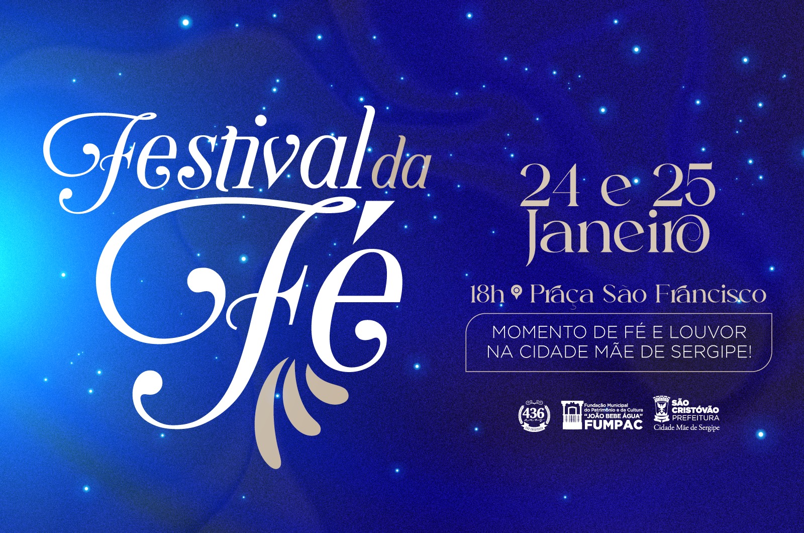 A Prefeitura de São Cristóvão, por meio da Fundação Municipal do Patrimônio e da Cultura (Fumpac), traz à Praça São Francisco, nos dias 24 e 25 de janeiro, o Festival da Fé, reunindo grandes nomes da música católica e evangélica. O evento integra as celebrações pelos 436 anos da quarta cidade mais antiga do Brasil, comemorados no dia 1º de janeiro.