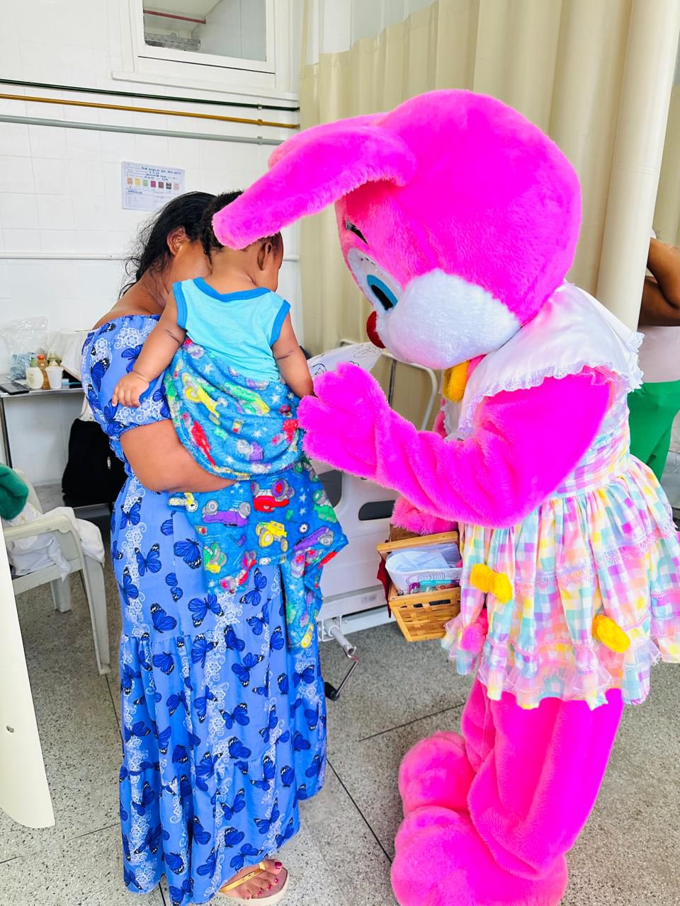 A iniciativa levou leveza e acolhimento ao ambiente hospitalar, com a visita de uma coelhinha da Páscoa, que percorreu os setores distribuindo carinho, sorrisos e momentos de descontração. A ação proporcionou uma pausa na rotina assistencial, transformando um dia que poderia ser marcado pela saudade de casa em uma experiência de alegria e conexão.